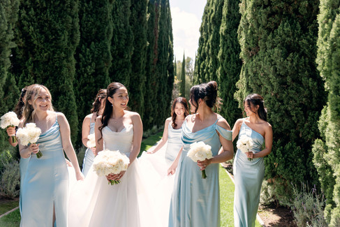 Meanwhile, Lauren got ready surrounded by her bridesmaids in soft blue gowns, a perfect complement to the classic tones of the estate’s stone and greenery. We took some sweet photos outside near the iconic cypress trees—her dress flowing as her bridesmaids helped arrange the train, laughing and twirling around her. There was something magical about capturing that quiet pre-ceremony excitement under the trees, with golden morning light filtering through the branches.